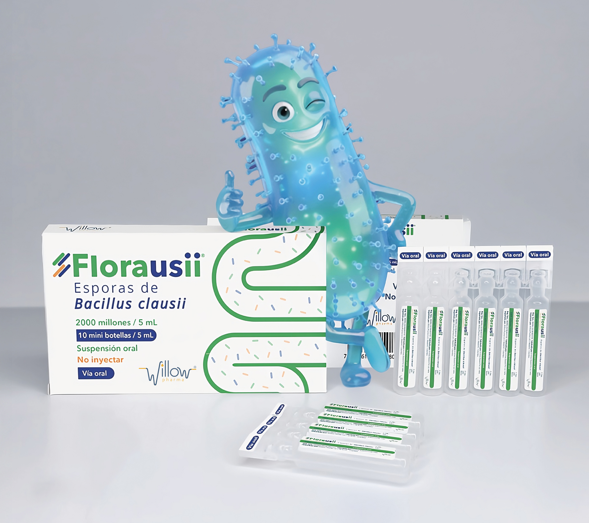 Florausii combina el efecto sinérgico de cuatro cepas de Bacillus clausii. Su presentación en caja contiene 10 mini botellas de 5 mL, con 2.000 millones de UFC (Unidades Formadoras de Colonias) por mini botella.
